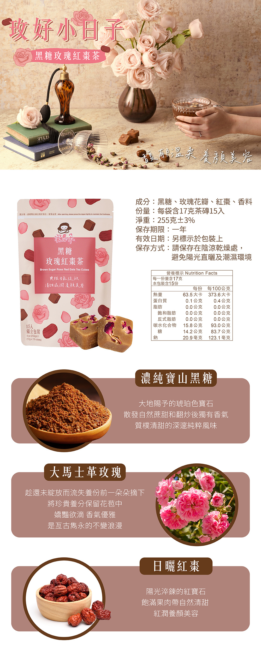 ※ 茶磚外觀色澤易受玫瑰花食材自然的褪色現象而變化,屬正常現象請安心飲用