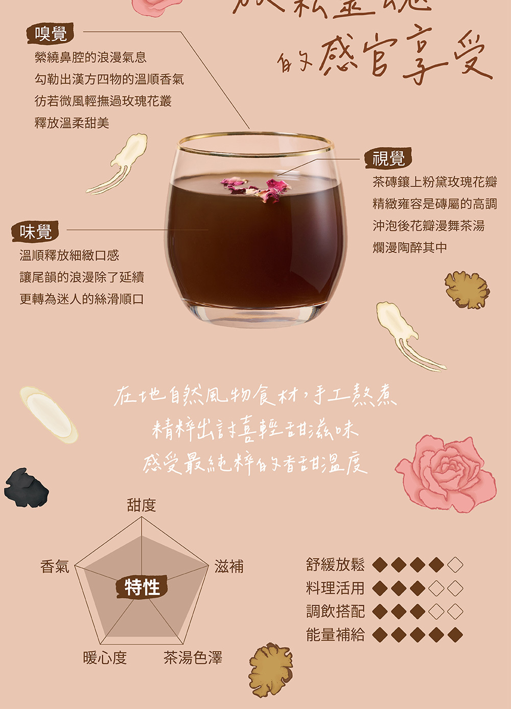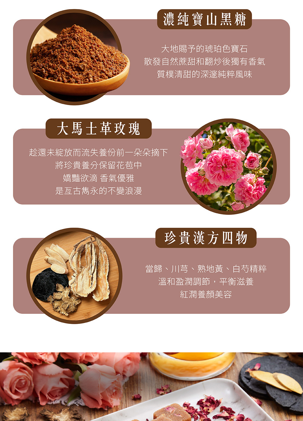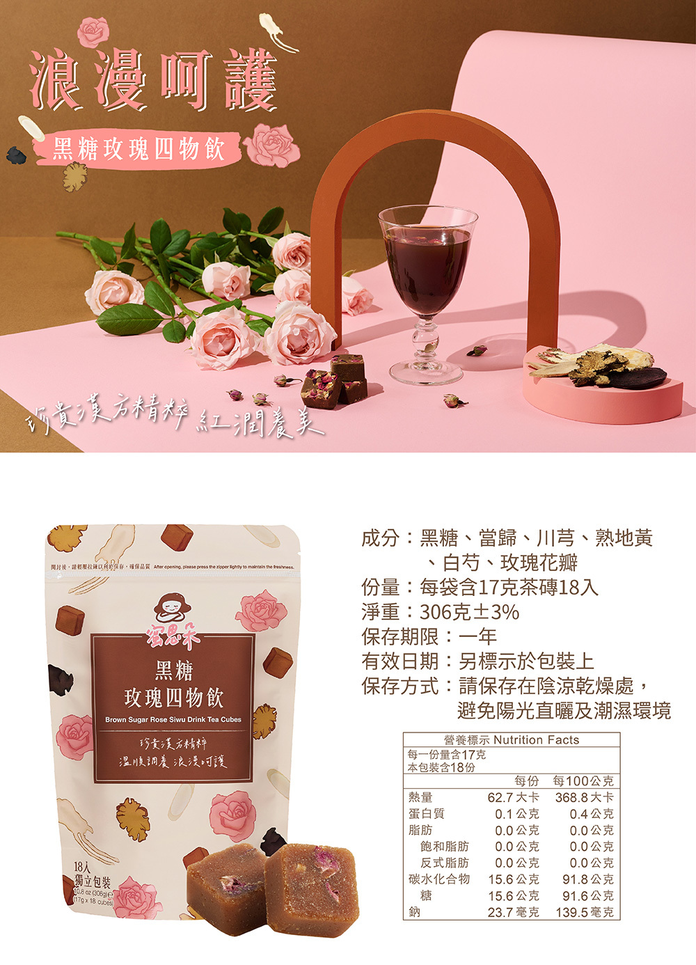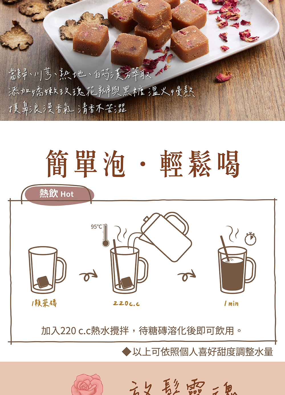 ※ 茶磚外觀色澤易受玫瑰花食材自然的褪色現象而變化,屬正常現象請安心飲用