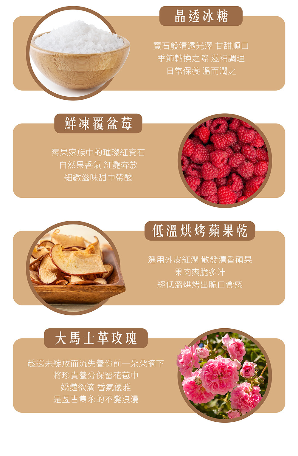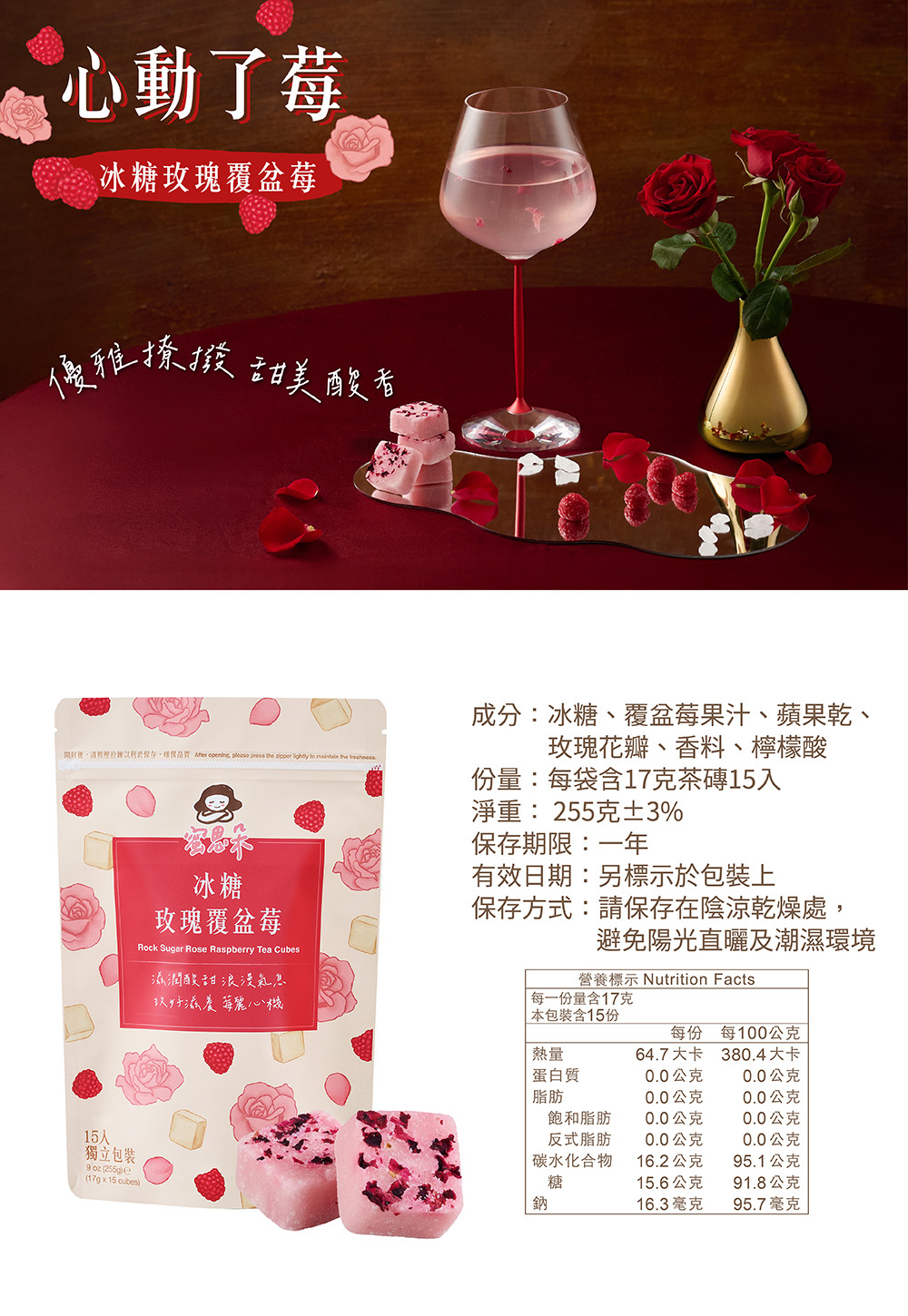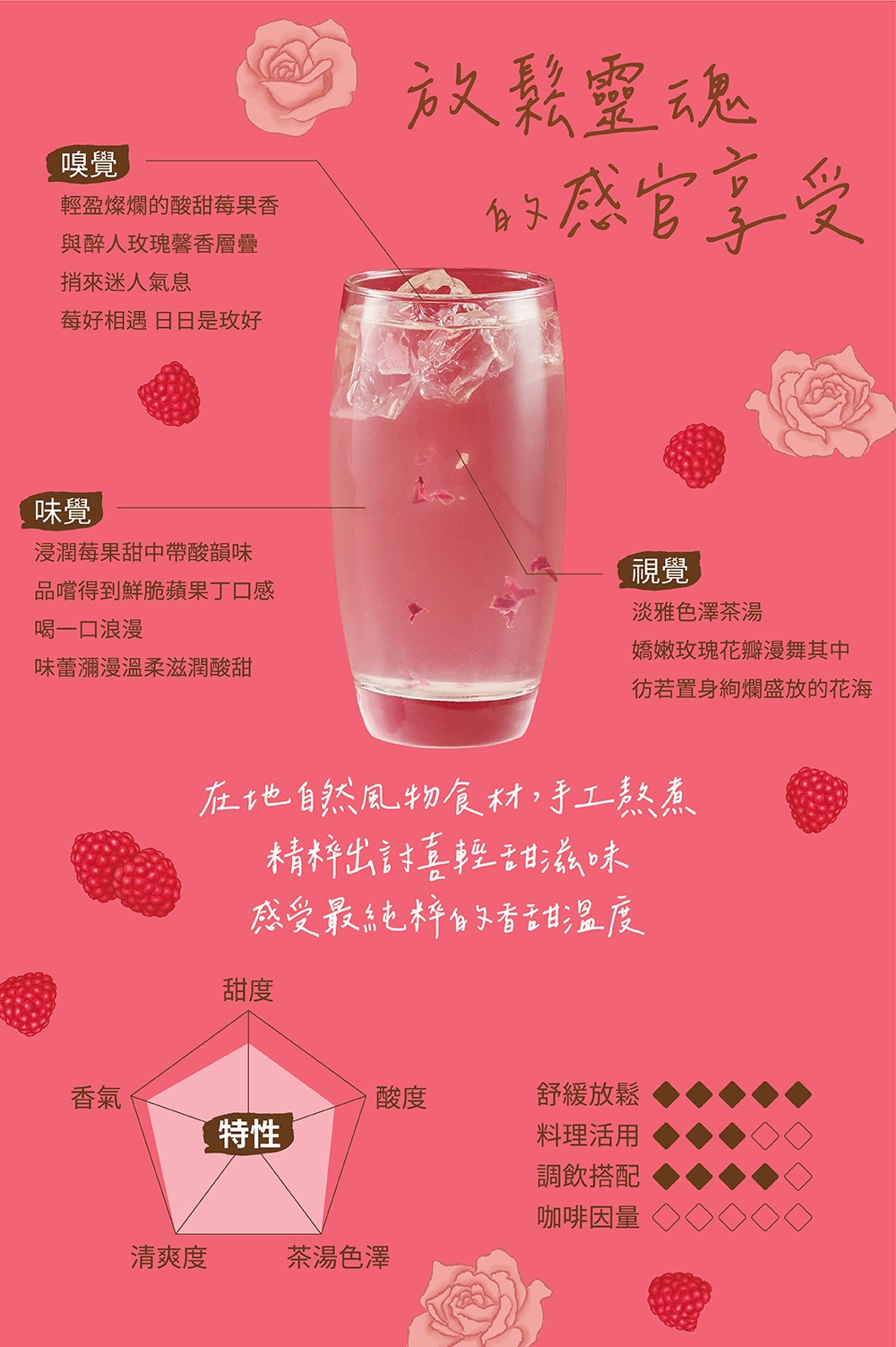 ※ 茶磚外觀色澤易受玫瑰花食材自然的褪色現象而變化,屬正常現象請安心飲用
